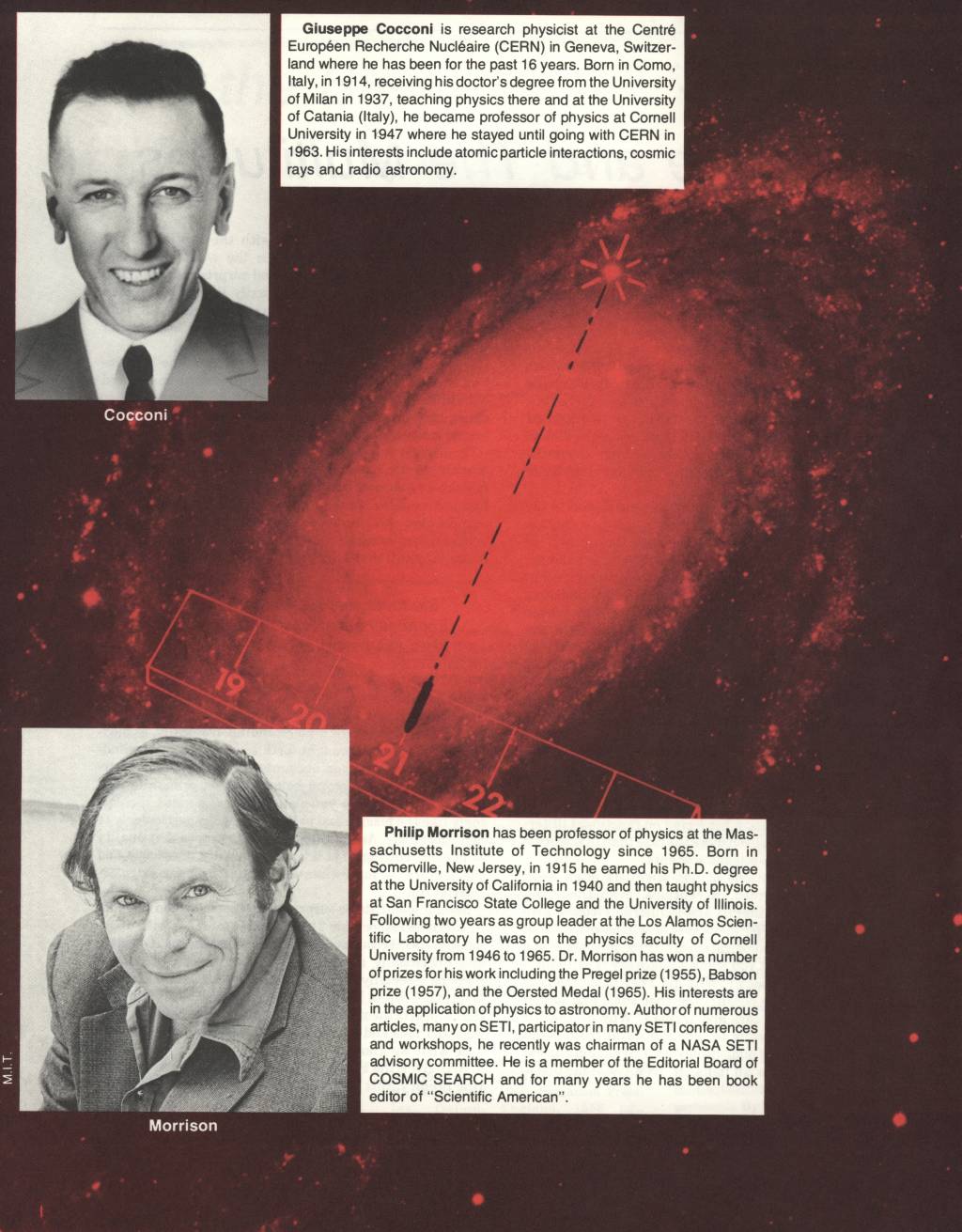 * NATURE, vol. 184, no. 4690, pages 844- 846, Sept. 19, 1959. Reproduced by permission. Cocconi and Morrison's article in NATURE was sandwiched between an article on the electronic prediction of swarming in bees and one on metabolic changes induced in erythrocytes by x-rays.