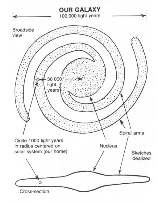 Our galaxy is an aggregation of perhaps 100,000 million stars arranged like a flat wheel or disc 100,000 light years