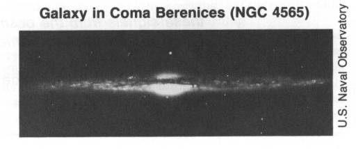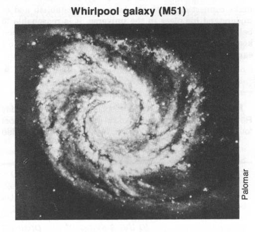 across, turning around once in about 300 million years. It has a nucleus with spiral arms radiating from it as suggested by the accompanying sketch (to the right). It may not look too different than the Whirlpool galaxy (M51) in the photograph alongside (to the left). The stars are more numerous in the spiral arms than between them and even thicker in the nucleus. It is believed that a cross-section would appear similar to that of the galaxy (NGC 4565) in the photograph (below).