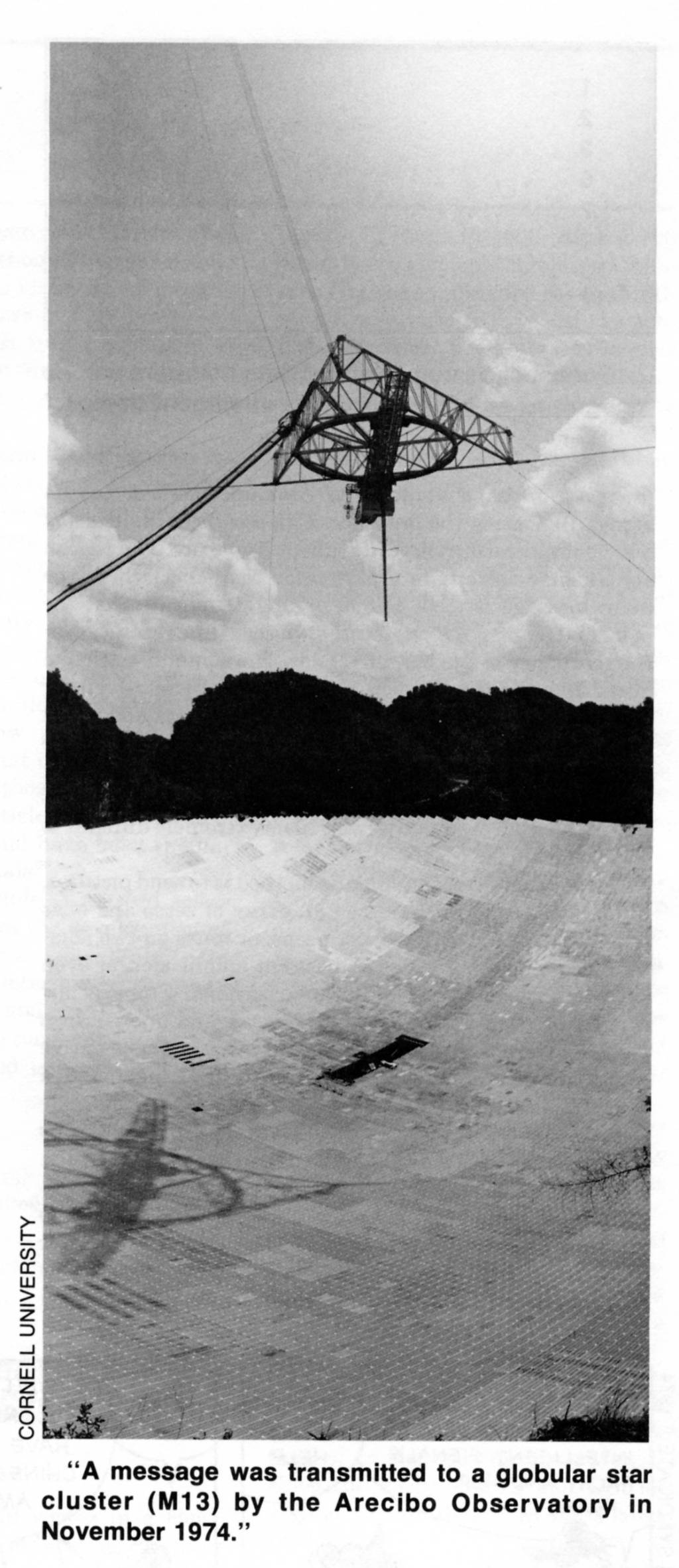 the Arecibo Observatory, which Cornell University runs for the National Science Foundation, in November 1974 at a ceremony marking the resurfacing of the Arecibo dish — the largest radio/radar telescope on Earth. The signal was sent to a collection of stars called M13, a globular cluster comprising about a million separate suns, because it was overhead at the time of the ceremony. Since M13 is 24,000 light years away, the message will take 24,000 years to arrive there. If anyone is listening, it will be 48,000 years