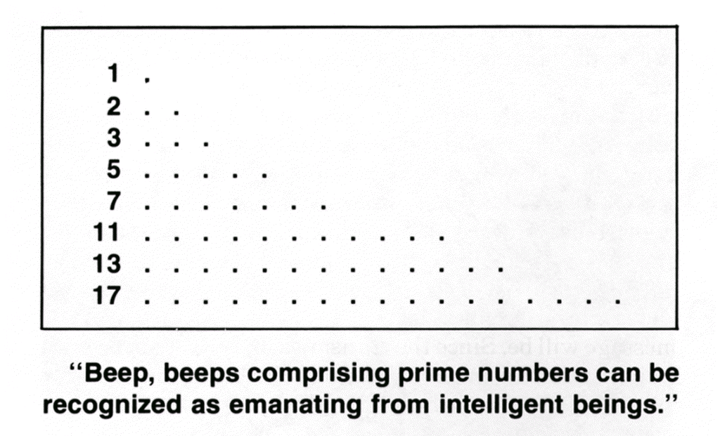 It is easy to create an interstellar radio message which can be recognized as emanating unambiguously from intelligent beings. A modulated signal ("beep," "beep-beep," . . . ) comprising the numbers 1, 2, 3, 5, 7, 11, 13, 17, 19, 23, 29, 31, for example, consists exclusively of the first 12 prime numbers — that is, numbers that can be divided only by 1, or by themselves. A signal of this kind, based on a simple mathematical concept, could only have a biological origin. No prior agreement between the transmitting and receiving civilizations, and no precautions against Earth chauvinism, are required to make this clear.