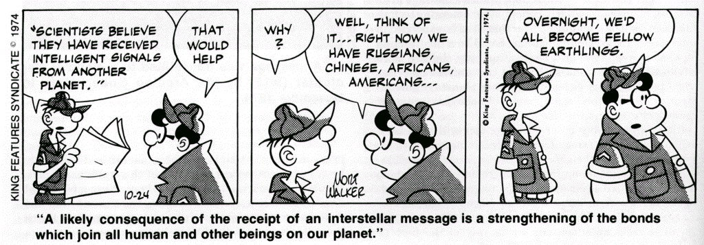 Another likely consequence of the receipt of an interstellar message is a strengthening of the bonds which join all human and other beings on our planet. The sure lesson of evolution is that organisms elsewhere must have had separate evolutionary pathways; that their chemistry and biology, and very likely their social organizations, will be profoundly dissimilar to anything which is familiar here on Earth. We may well be able to communicate with them because we share a common universe; because the laws of physics and chemistry and the regularities of astronomy are shared by them and by us. But they may always be, in the deepest sense, different. And when we recognize these differences, the animosities which divide the peoples of the Earth may wither. The differences among human beings of separate races and nationalities, religions and sexes are likely to be insignificant compared to the differences between all humans and all extraterrestrial intelligent beings.