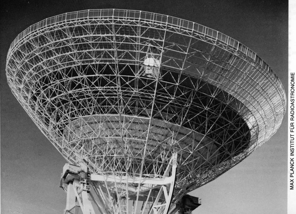 (World's largest fully-steerable radio telescope 100 meters in diameter at Bonn, Germany.)