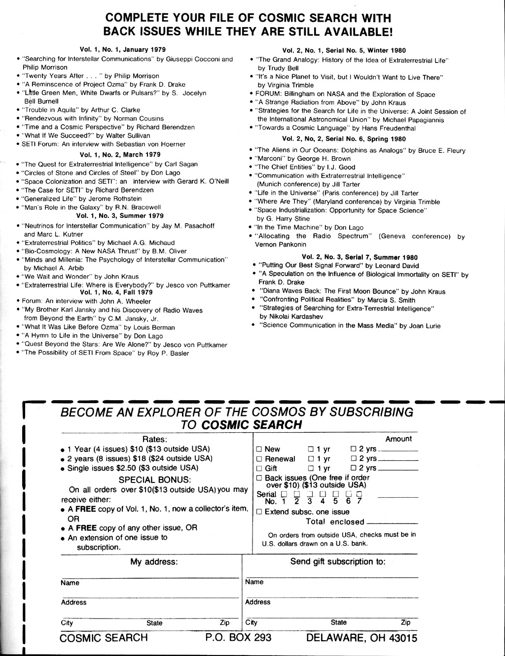 Cosmic Search: Issue 8(Volume 2 Number 4; Year End 1980) [Click on each advertising image below to obtain a larger image. The page in the magazine on which each ad was found in noted above the image.]