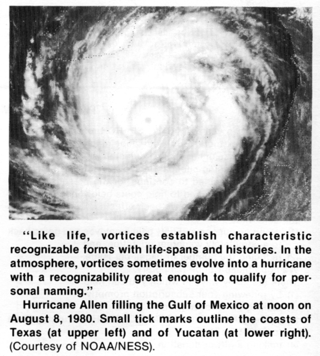 Second, it is intuitive to link life as a system with those processes which occur when the change of free energy is larger than a certain value. Such a limit is well recognized in studies of fluids as the Reynolds number which marks the onset of vorticity or whirlpool-like formations. Like life, vortices establish characteristic recognizable forms with life-spans and histories, and when they form they confer a new sort of dynamic stability upon their environment. On the larger scale in the atmosphere, such vorticity sometimes evolves to the intricate structure of a hurricane and a recognizability great enough to qualify for personal naming.