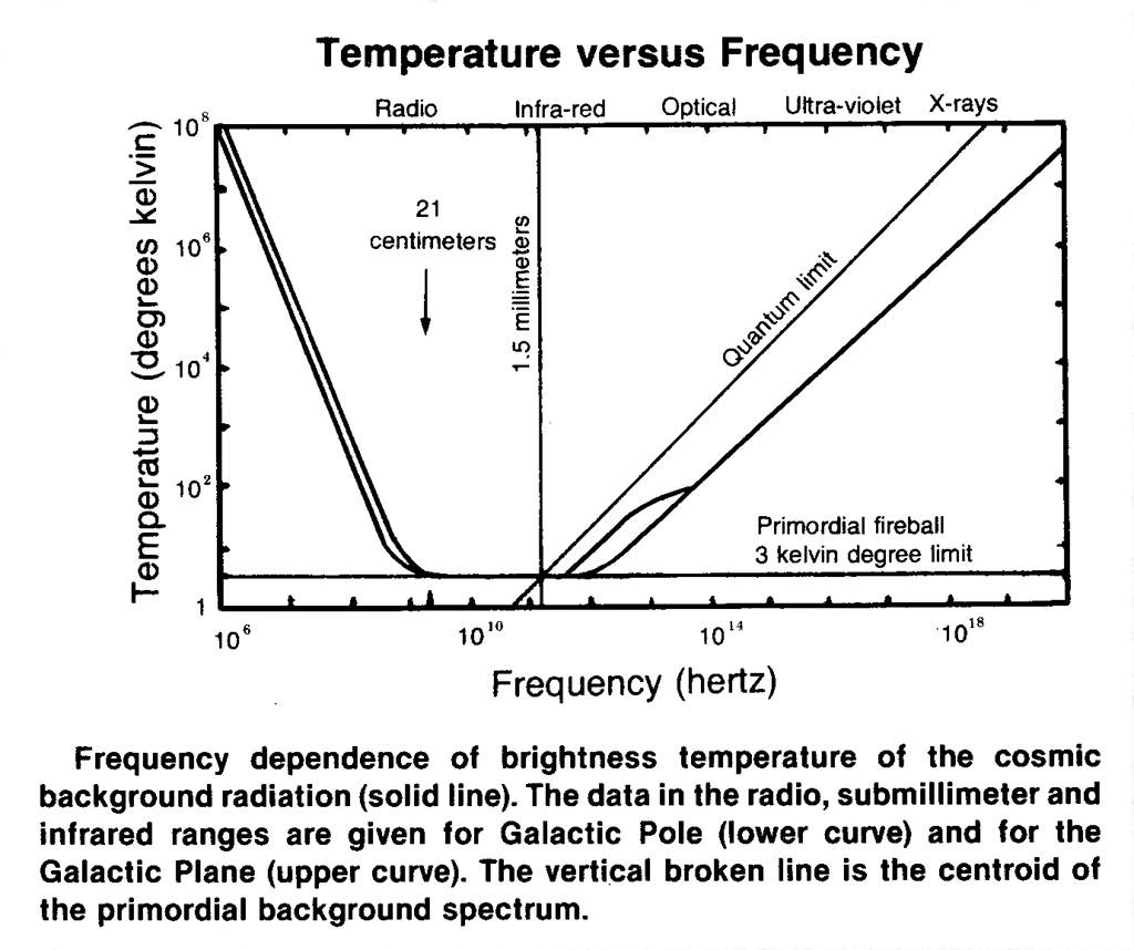 Finally, several appraisals are given of the possibility of detecting at our present technological level, extraterrestrial civilizations. Such calculations are very reliable because they are based on the well-known propagation conditions for electromagnetic signals in space. The temperature versus frequency chart [below] shows the frequency dependence of brightness temperature of the cosmic background radiation and the location of the two main SETI search ranges. The range near the famous radio line of hydrogen at 21 centimeters corresponds to the presumption of omnidirectional transmission, and is intended for searches for signals from the nearest planetary systems.