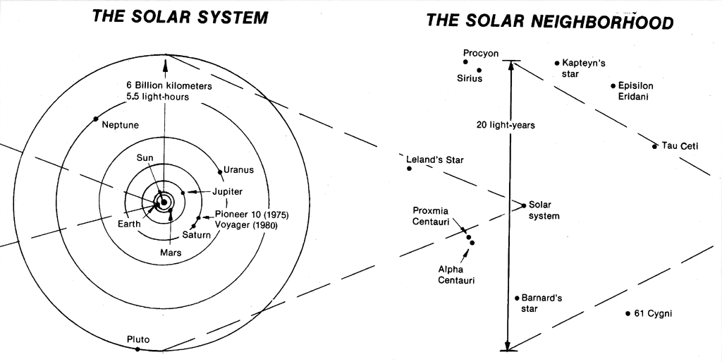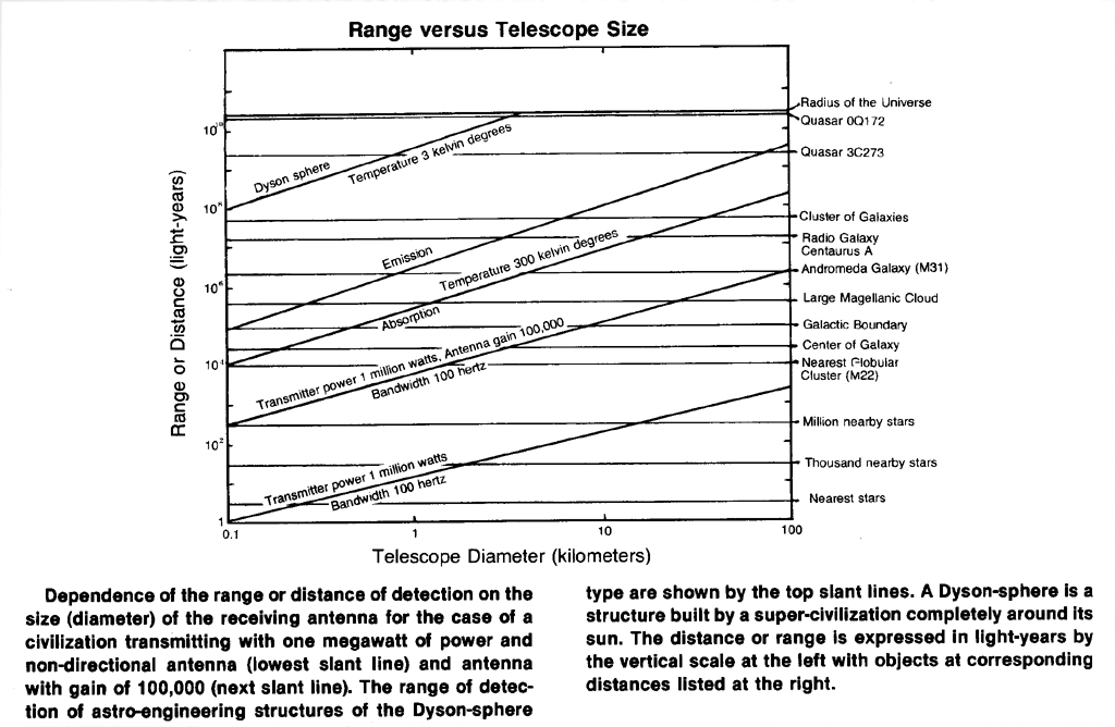 The graph of distance versus telescope size [below] illustrates these conclusions. Estimates are made for possible detection of astro-engineering structures of the Dyson-Sphere type at temperatures of 3 and 300 degrees kelvin radiating the same power as the sun does, but in the infrared and millimeter range, as well as for meaningful signals of about the same power sent by a supercivilization. The graph also shows detection capabilities for transmitters similar to those available on Earth, corresponding to the concept of "terrestrial chauvinism" (lower curves). Note that the range of detection, for the "evolutionary" concept (corresponding to the upper curves) is many orders of magnitude larger.
