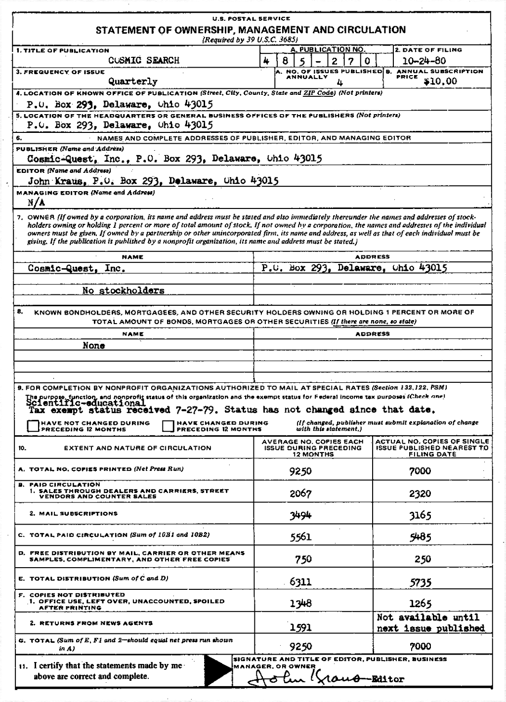 Contributions, however, will be gratefully accepted in any amount. Checks should be made payable to Cosmic Quest, Inc., P.O. Box 293, Delaware, Ohio 43015.