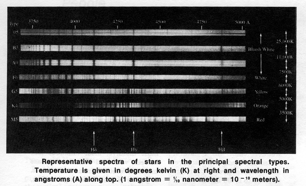 Fortunately for us, it is not necessary to determine all there is to know about each star. It is true that every star is different from any other star in some respect, but there are sufficient similarities amongst stars that millions and billions of stars can be classified into a very small number of classes or types by rather a limited set of parameters. The most useful and one of the easiest to obtain is the spectral type.* (*When the light of a star is passed through a prism it may be spread into a spectrum or rainbow of colors, each color representing a different wavelength. From such stellar spectra stars can be classified. — Ed.)