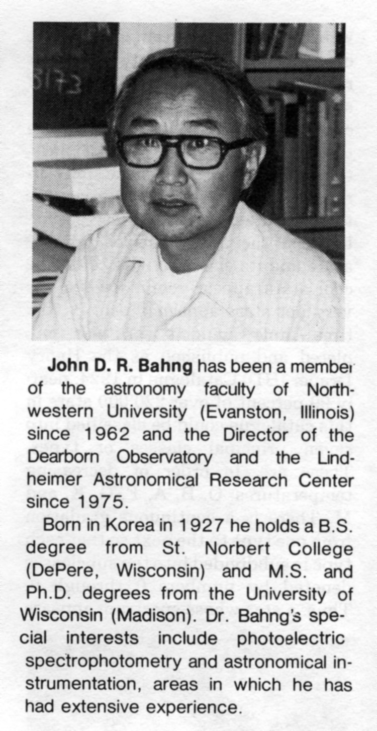 John D. R. Bahng has been a member of the astronomy faculty of Northwestern University (Evanston, Illinois) since 1962 and the Director of the Dearborn Observatory and the Lindheimer Astronomical Research Center since 1975.