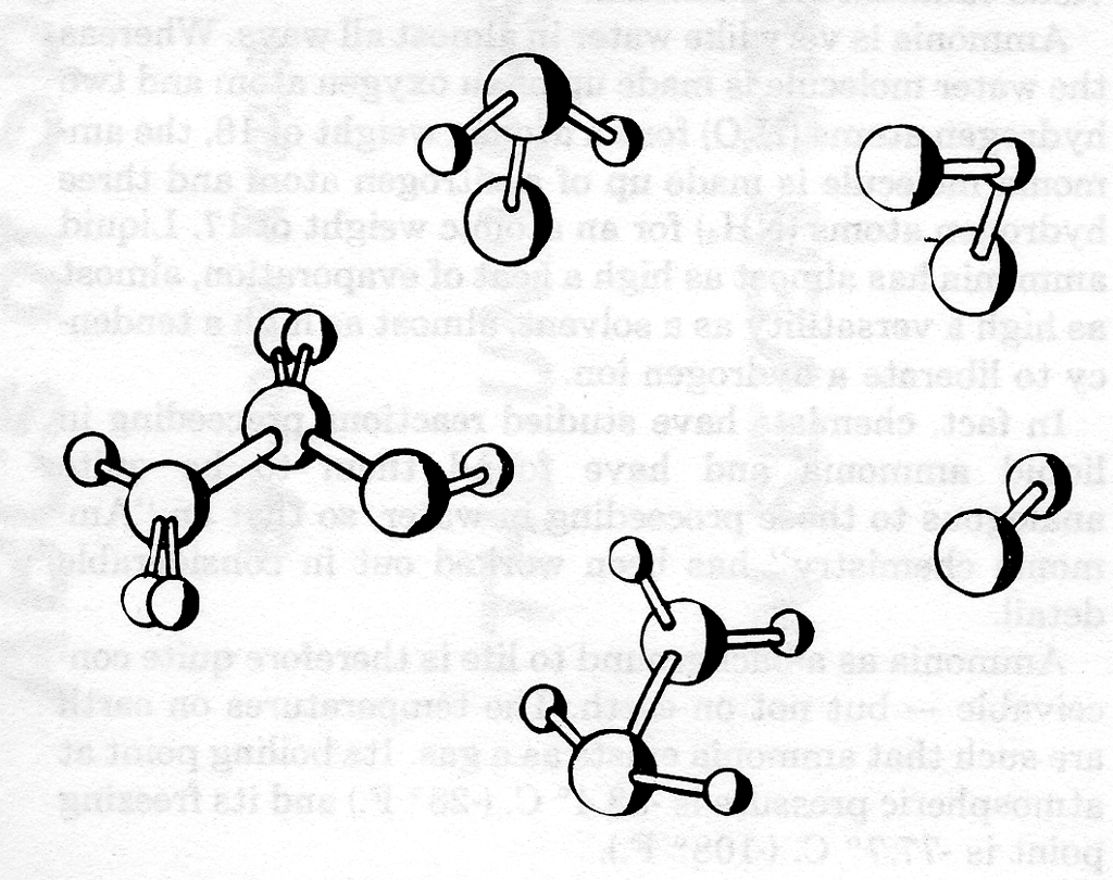 Ammonia is very like water in almost all ways. Whereas the water molecule is made up of an oxygen atom and two hydrogen atoms (H2O) for an atomic weight of 18, the ammonia molecule is made up of a nitrogen atom and three hydrogen atoms (NH3) for an atomic weight of 17. Liquid ammonia has almost as high a heat of evaporation, almost as high a versatility as a solvent, almost as high a tendency to liberate a hydrogen ion.