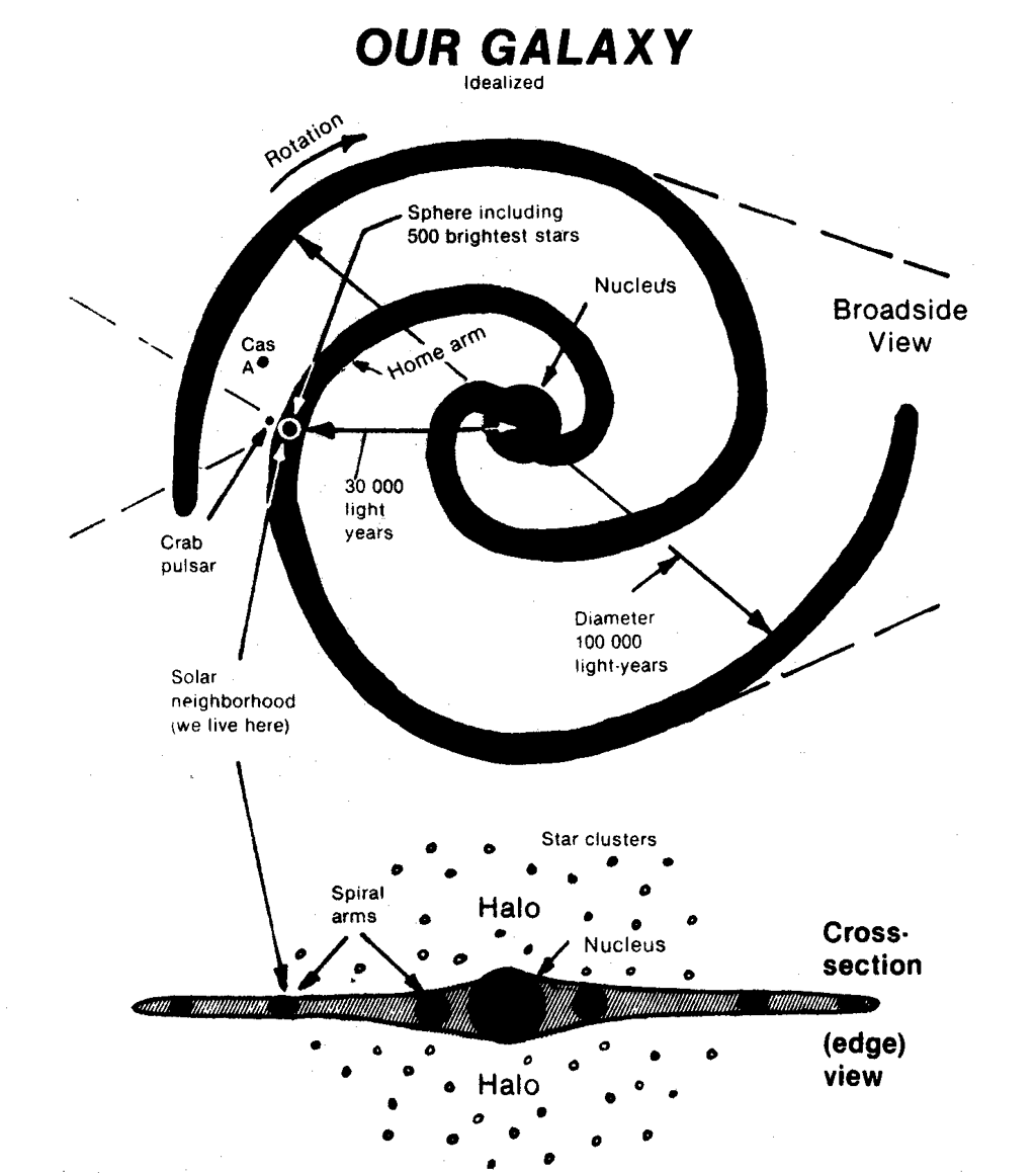 The solar system where we live is in a spiral arm about two-thirds of the way to the edge (30,000 light-years from the center). Most of the 500 brightest stars in the sky are relatively close (within 1000 light-years). The Crab pulsar and Cassiopeia A (Cas A) are further from the solar neighborhood.