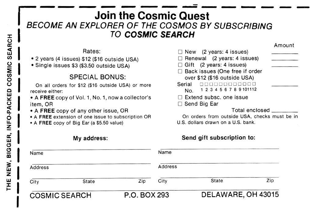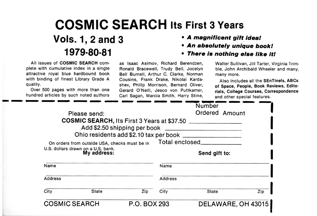 Cosmic Search: Issue 13(Volume 4 Number 1; First half 1982) [Click on each advertising image below to obtain a larger image. The page in the magazine on which each ad was found in noted above the image.]