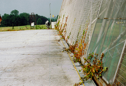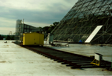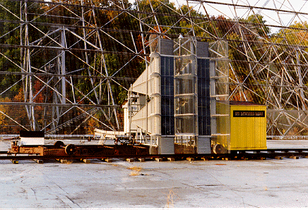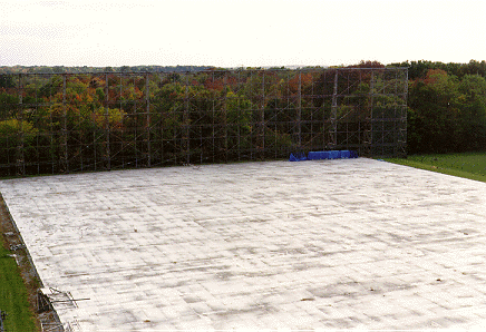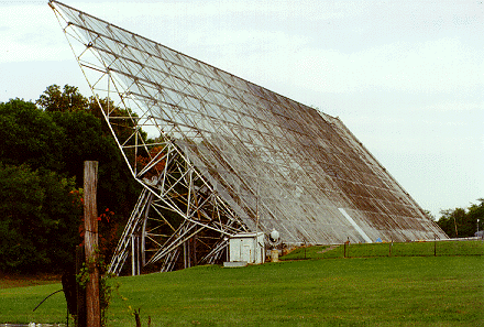 an aluminum-covered ground plane measuring 360 feet wide by 500 feet long, and two feed horns mounted on a movable assembly. The reflectors were not solid, but were actually covered in a mesh pattern with small gauge wires. The spacing of the wires was